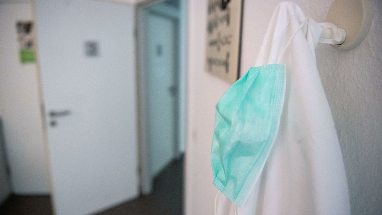 15 April 2020, Baden-Wuerttemberg, Stuttgart: A mouthguard hangs over a doctor’s coat in a family doctor’s surgery in a treatment room. (to dpa “How telemedicine proves itself in the Corona crisis”) Photo: Marijan Murat/dpa (Photo by Marijan Murat/pi